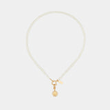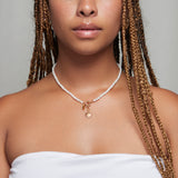 Our handcrafted necklace was beaded by hand with genuine freshwater pearls and can be worn with or without the removable charm medallion. It’s reversible, so you can wear the pearls on the front, or choose to display the golden detail and Aurora sun charm.