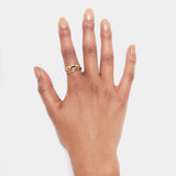 Bagues empilables de notre collection Temple of the Sun. Ce combo minimal se compose des 3 bagues suivantes: 1 Bague Cléo Coulée, 1 Bague Trinity Coulée et 1 Bague Simple Coulée.