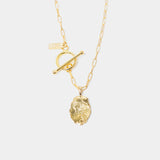 Inspirée de vieux médaillons romains, cette pièce artisanale a un corps féminin nu délicatement représenté d’un côté. Sexy et subtil, ce dessin représente la beauté de la forme féminine, tout simplement. La chaîne massive est un look audacieux en soi, mais aussi idéal pour la superposition avec d’autres colliers. Spécialement conçu pour être porté avec une robe florale sans manche qui vole dans le vent chaud de l’été au large des côtes italiennes.
