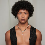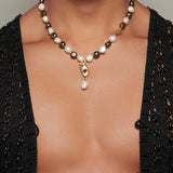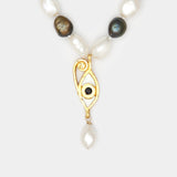 Inspirée des puissantes déesses de l'Égypte ancienne, l'Ayla veille toujours sur vous. Elle est composée de véritables perles baroques, noires irisées et blanches nacrées. L'œil d'Horus est soigneusement peint en résine et orné d'une larme de joie faite d'une perle d'eau douce de forme naturelle. Nous proposons également cette pièce en or massif 14k.