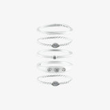 Bagues superposables de notre collection Temple of the Sun. Ce combo extra luxueux se compose des 5 bagues suivantes: 1 Bague Coulée Simple, 2 Bagues Eye of Horus Braided, 1 Bague Simple Cléo Diamond et 1 Bague Trinity Sunrise Diamond